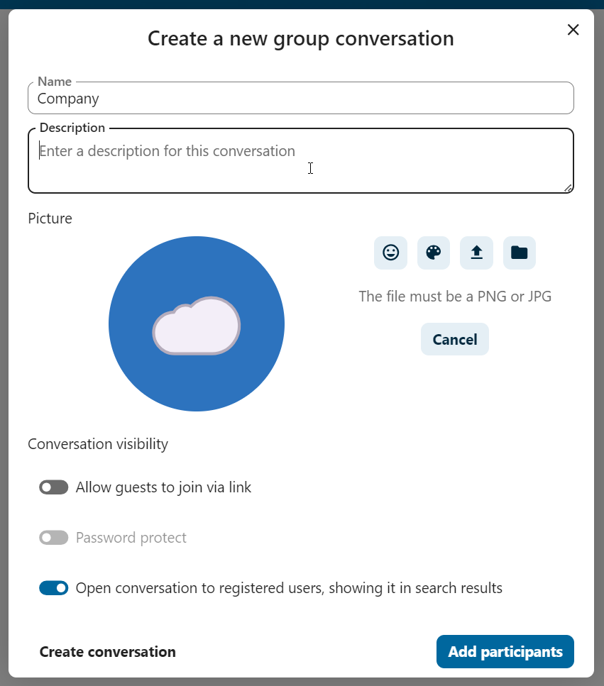 You can then pick a name for the conversation, put a description, and set up an avatar for it (with uploaded photo or emoji), and select if the conversation should be open to external users and if other users on the server can see and join the conversation.