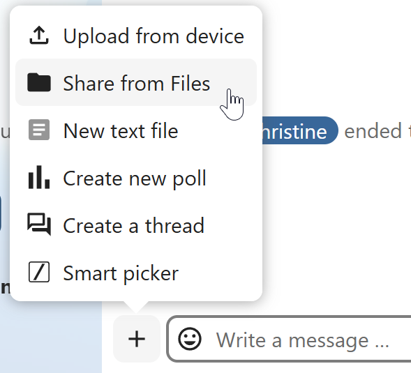 Smart picker shortcut makes it easier to insert links, files, or other content into your conversations. Just choose the type of content you want to insert (files, Talk conversations, Deck cards, GIFs, etc.) You can also type / in the chat input to open the selector.