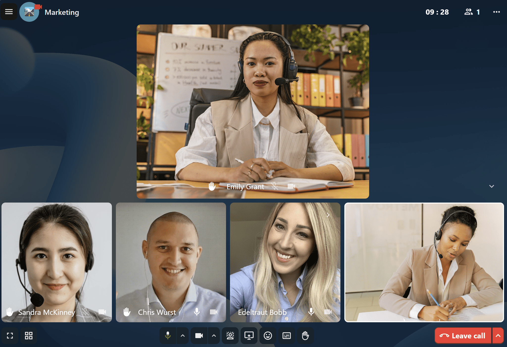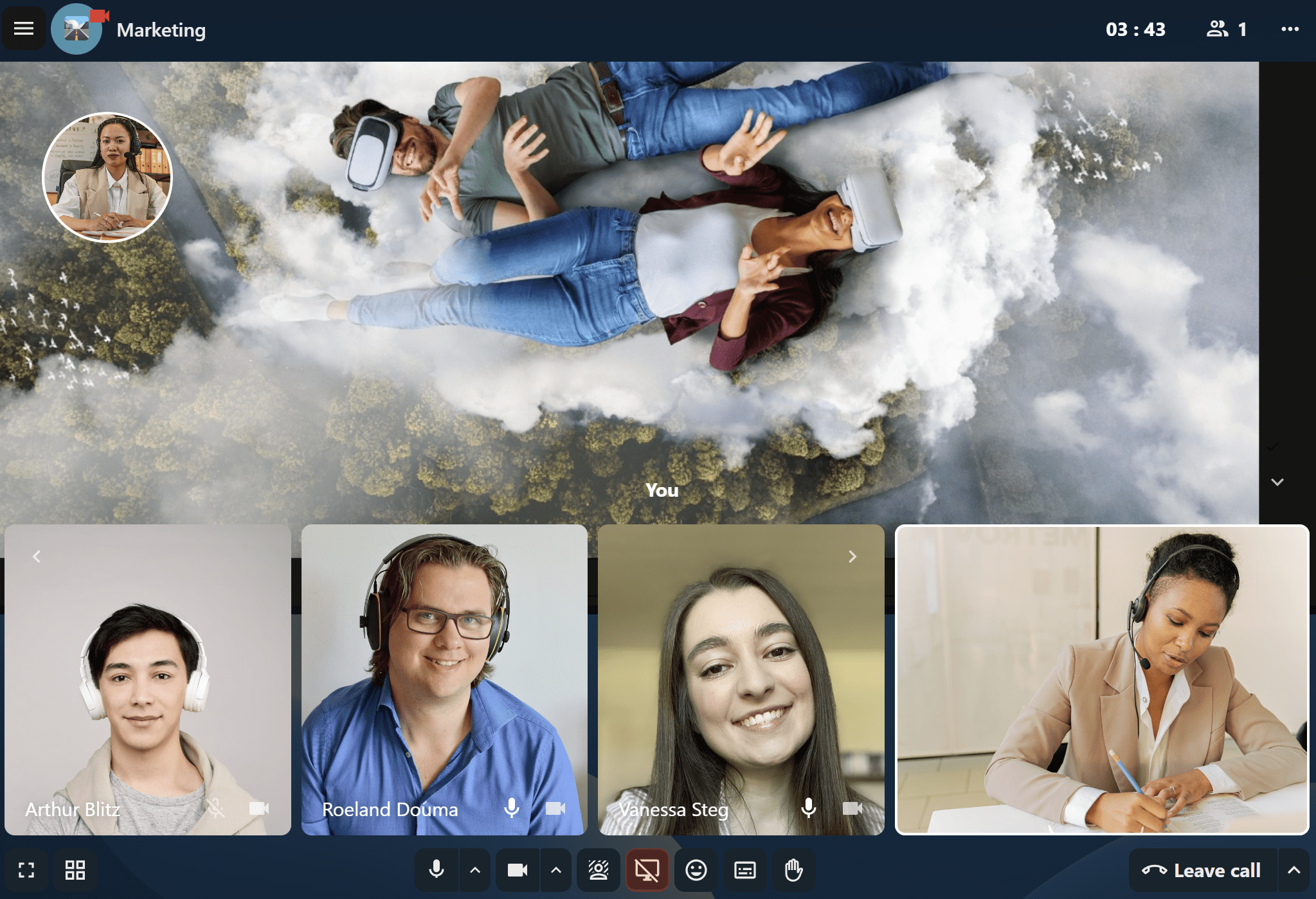 The promoted view shows the speaker large and others in a row below. If the people do not fit on the screen, buttons will appear on the left and right that let you navigate.